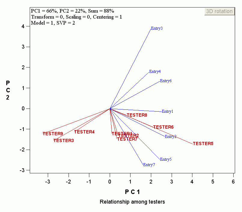 Note that PC1 explains mostly the variation of tester main effect (E), and PC2 mostly that of the entry main effect (G). Thus, Testers 5, 6, and 8 had obviously higher mean values than testers Testers 9, 3, and 5. Entries 5 and 7 had obviously higher mean values than entries 3, 4, and 6. WhyBecause all testers are on the side of entries 5 and 7! In other words, Entries 5 and 7, in contrast with entries 3, 4 and 6, 'interacted' positively with all the testers.