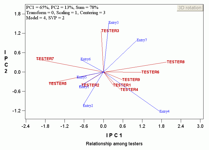 Since entry and tester main effects have been removed, this biplot explains only the interaction GE. It is characterized by entries and testers falling in all directions. This biplot is most effective in displaying the GE patterns but cannot be used in selecting superior entries or testers. You have to use a GGE biplot (models 1- 3) for this purpose. That is, to select superior entries, the entry main effect G must be reconciled with the GE. This is a very important concept; its importance is manifested by the terms "GGE biplot" and the fact this software is called "GGEbiplot".