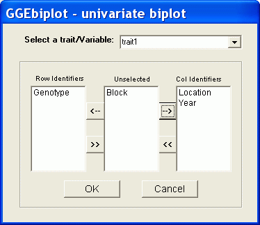 This device allows generating any possible biplot for a trait or variable. In the current example, a genotype by environment biplot for "trait1" will be generated, with environments being year-location combinations.