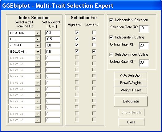 Multi-Trait Selection Index calculator in GGEbiplot combines three major selection strategies, i.e., Index Selection, Independent Selection, and Independent Culling in a single user-friendly interface, and is a powerful tool for genotype evaluation and selection.