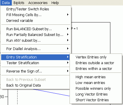 When this function is invoked, GGEbiplot first calculates the means of the entries across testers and scaled by the largest mean of all entries . It then asks the user to set a criterion based on which entries with low means are selected. This function may not make sense when the entry main effect (G) is too small relative to the interaction (GE). When this is the case, there will be wide angles (i.e., negative correlations) between the Testers.