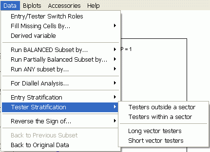 When this function is invoked, GGEbiplot first calculates the angles of the testers, relative to an arbitrary reference point. It then asks the user to set a sector defined by an upper and a lower bound; all testers WITHIN this sector will then be retained and a new biplot generated.