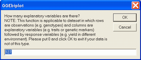 Under the main menu VBV Biplot, click Covariate-effect biplot, and select r-Matrix (or b-matrix). An input box will appear, asking for how many markers are there in the combined two-way table. In our case of the barley H-T mapping data, it is 127: