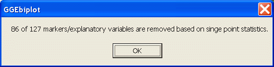 Note that the probability level is arbitrary and is determined by the user. In general, the level can be more stringent if there are many markers, which will reduce the work later on without losing important information. GGEbiplot will screen the markers using this criterion and notice you how many markers are removed: