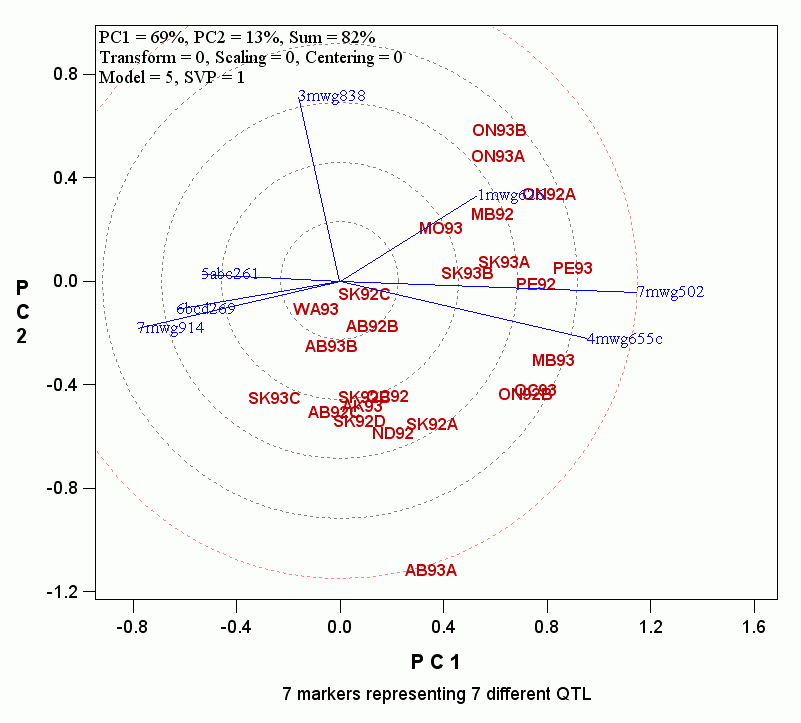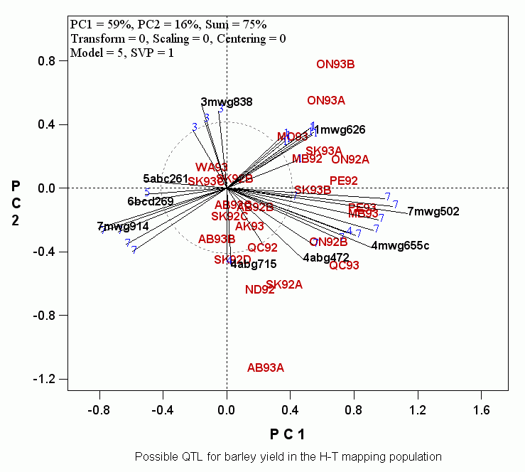 The following biplot shows that the markers fall into 5 distinct groups. This suggests that at least 5 QTL are involved in determining the yield difference between the two parents (Harrington and Tr306). Since the linkage groups are known, as indicated by the number preceding the marker names, it is clear that more than 5 QTL are involved, distributed in chromosomes 1, 3, 4, 5, 6 and 7, respectively: