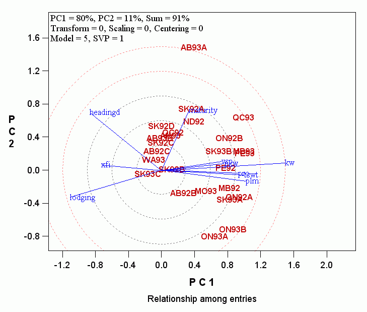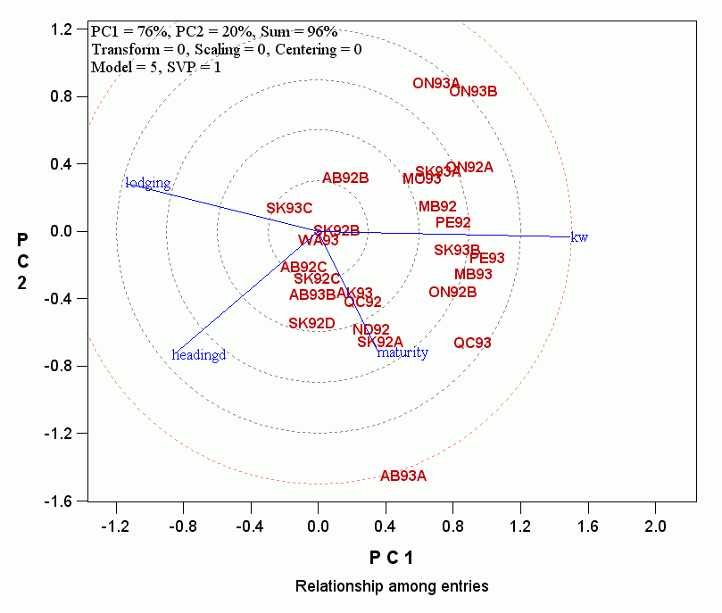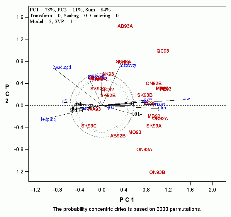 - Note that there are 5 circles labeled as 0.01, 0.01+, 0.01++, 0.01-, and 0.01-- . Multiple circles are presented because the biplot does not explain 100% of the total variation. Therefore, the threshold is a range rather than a precise level. The length of the vector of a trait, or of a simulated observation, is determined by the magnitude of the trait's effect on the target trait. However, it is also affected by two factors: 1) the similarity of the trait with other traits, and 2) the consistency of the trait's effect across environments. More specifically, if a trait is similar to many other traits, its vector tend to be longer, because the similarity forms a strong pattern, which is likely to be captured by one of the first few PC's. For the same reason, if the effect of a trait is relatively consistent across environments, which also represents a strong pattern, it is more likely to be captured by one of the first few PC's. Therefore, the threshold circle with the shortest vector is more appropriate to select any traits that have a strong effect in any environment, whereas the threshold circle with the longest vector is more appropriate for selecting traits with strong effects in most environments. It is up to the user to decide which circle is used to remove "unimportant" explanatory traits. The difference caused due to these factors in our example is whether the traits PM and PMGROUP (both are powdery mildew scores) are excluded or included. Here we remove all the traits that fall within the circles, and the biplot becomes: