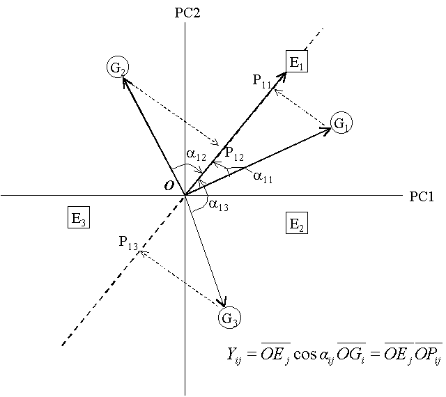 A biplot is a graphical displays of a two-way table. If the two-way table is 100% displayed by the biplot, then there is a strict trimetric relationship between the value of entry i in tester j, Yij, and their coordinates in the biplot. Verbally, the value of Entry i in Tester j is the vector length of Entry i (OGi) multiplied by the vector length of Tester j (OEj) and multiplied by the cosine of the angle between Entry i and Tester j (aij). Many important interpretations of biplots are based on this principle.