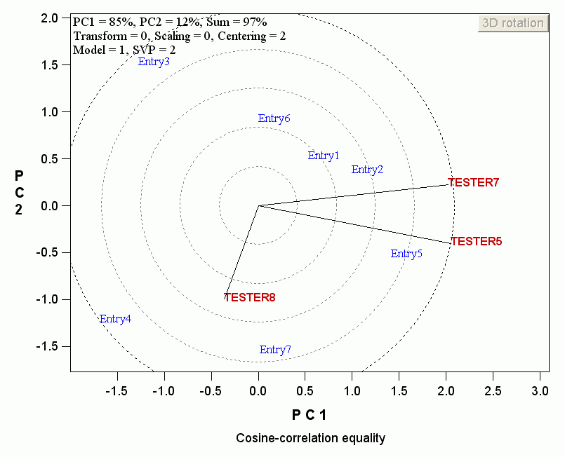 Examine the angles among the three testers in the following biplot and compare with the correlation coefficients among them in the table below. The correspondence should be near-perfect as the biplot explained 97% of the total variation.