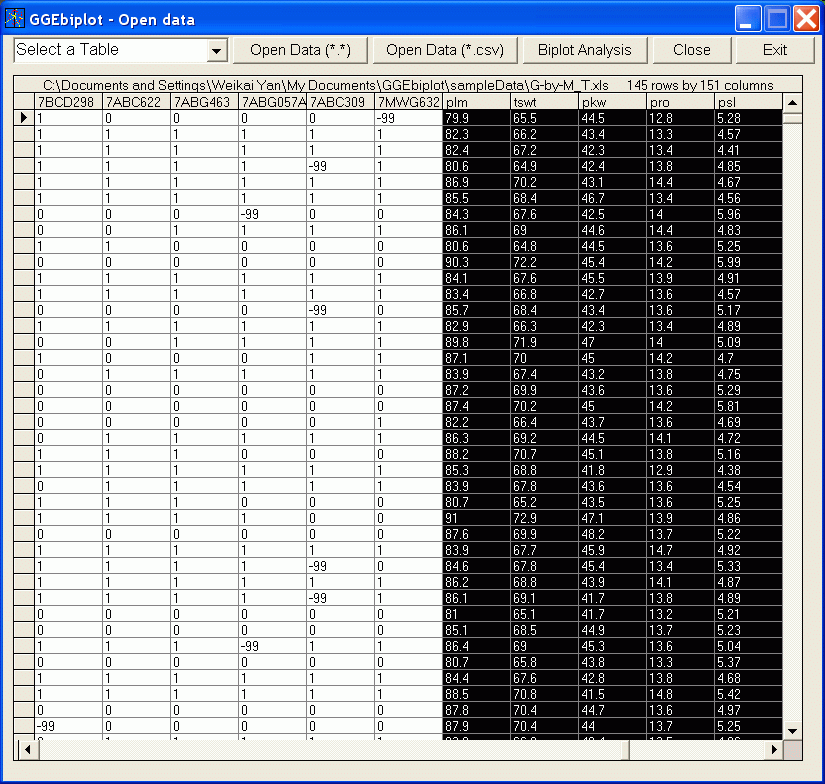 The following snapshot is part of a barley QTL mapping dataset, in which the rows are 145 barley doubled haploids, and the columns are 127 genetic markers plus 22 agronomic/quality traits. Only part of the data is shown. The highlighted columns are traits, and the un-highlighted are markers. (Note that the milling values are indicated by "-99" in this case, although it can be anything, preferably leaving them empty if it is an MS Excel file.)