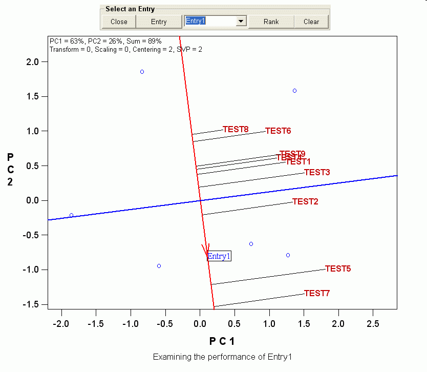o A red line passing through the biplot origin and the selected entry, which is referred to as "Entry1 axis",