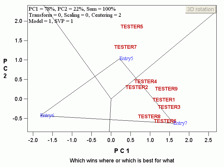 NOTE: Since the biplot explain 100% of the variation about these three entries, it allows accurate visual comparison among the entries.