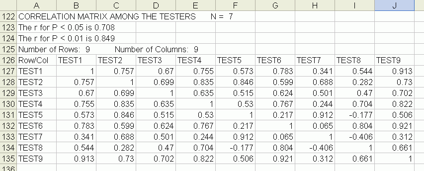 Under Accessories, Select Conventional Analysis, and select Correlation matrix among testers. The correlation matrix will be calculated and printed to the log file. When opened with Excel, it will look like: