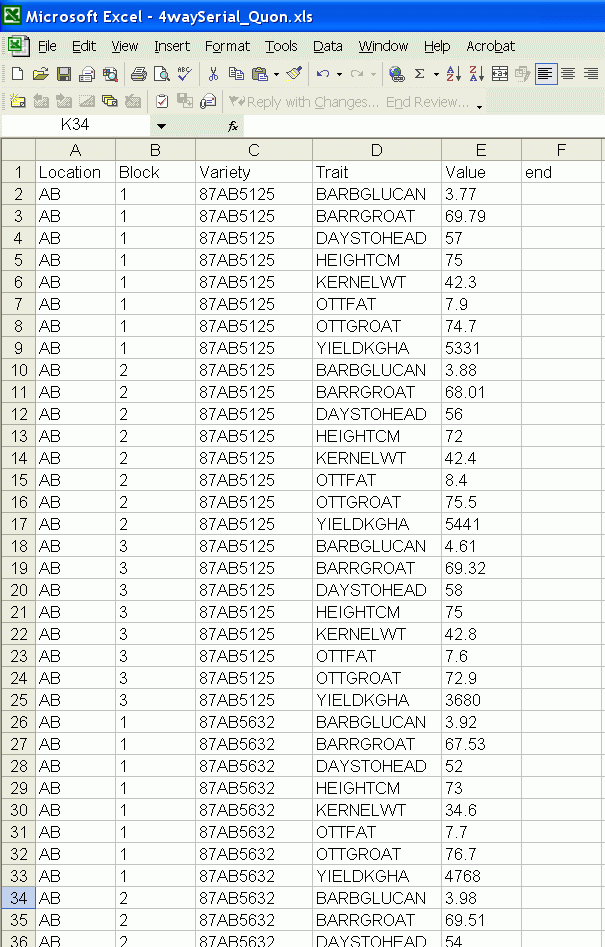- The first row is the header, containing the names of the columns, namely, 1) "Tester name", 2) "Block name", 3) "Entry name", and 4) "Trait name" , and 5) "Value". The end of the header should be indicated by the word "End" if the file is in text format.